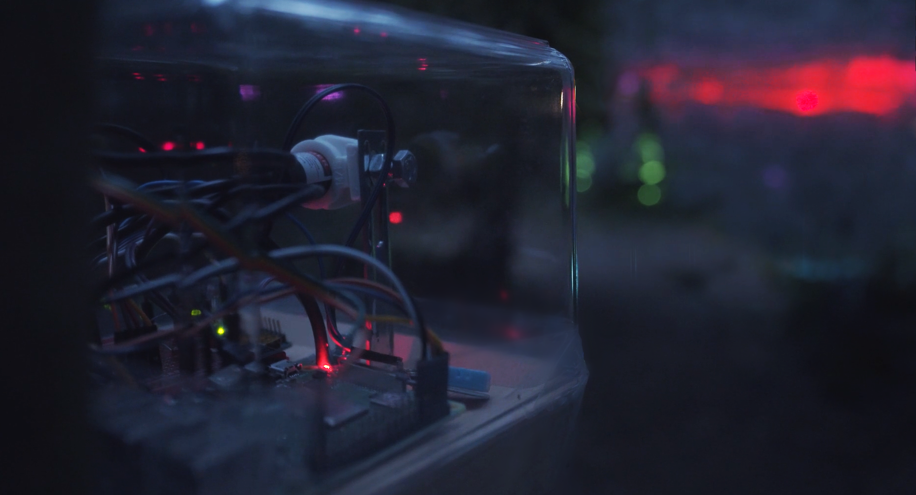 Six custom made modules are attached to the trees and directed to a central suspended sculpture. Each module is composed of one Raspberry Pi, an Arduino board, sensors measuring humidity, temperature and light amount, a laser pointer and a speaker.