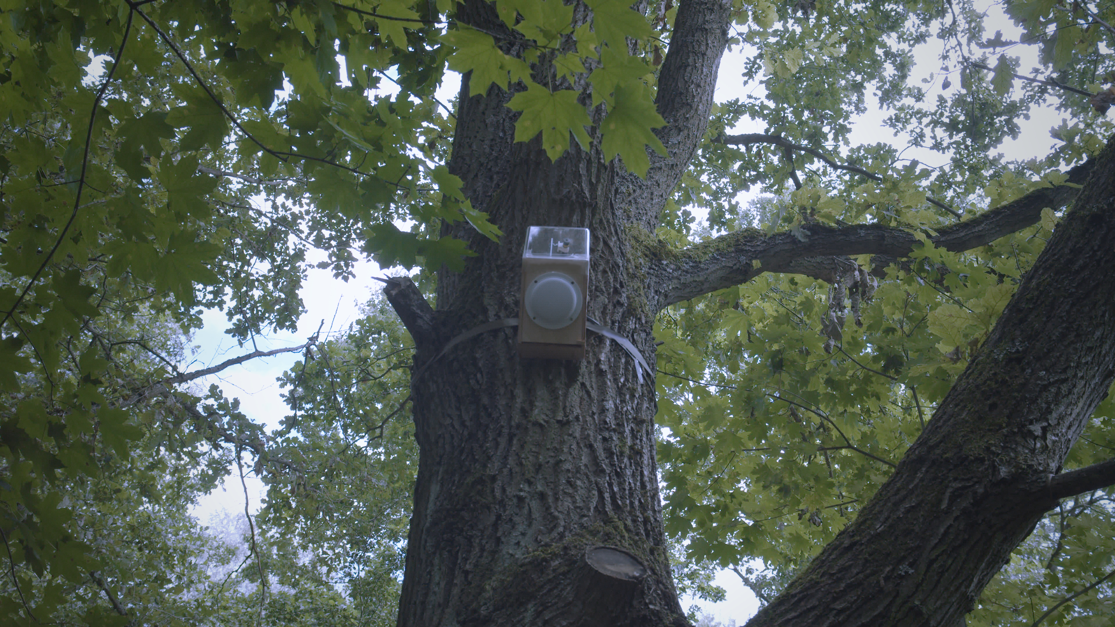 The system behaves like a small network, in which each element plays its role in the generation of the sound and light composition. Here the main inspiration was the invisible carbon exchange trees have through their root network, that link them together with the help of fungi (mycorrhizal network). The sounds produced by each module generate an abstract dialogue between trees covering a path at the forest entrance. Like a living organism, the behaviour of the audiovisual work changes over the time of the day and the passing of seasons, influenced by weather conditions and humidity of the air.